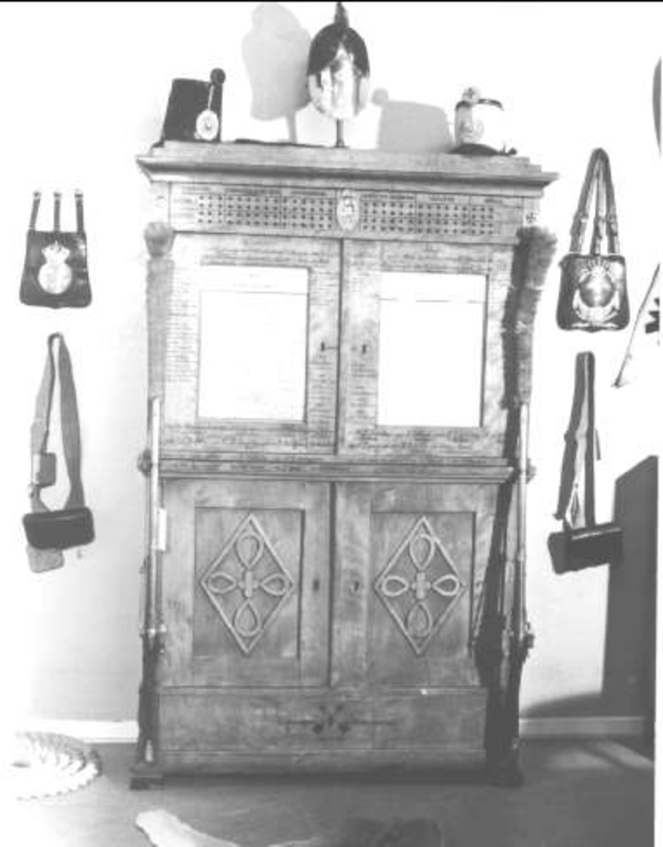 Skvadronschefsskåp vid Örebro skvadron K 3, med alla skvadronschefers namn antecknade på framsidan från 1791-1963. Skåpet tillverkat av Mj. HH von Esseen, chef Örebro skvadron 1839-1856. Nedre delen tillverkad (färdig) 1842. Övre delen tillverkad (färdig) 1855.