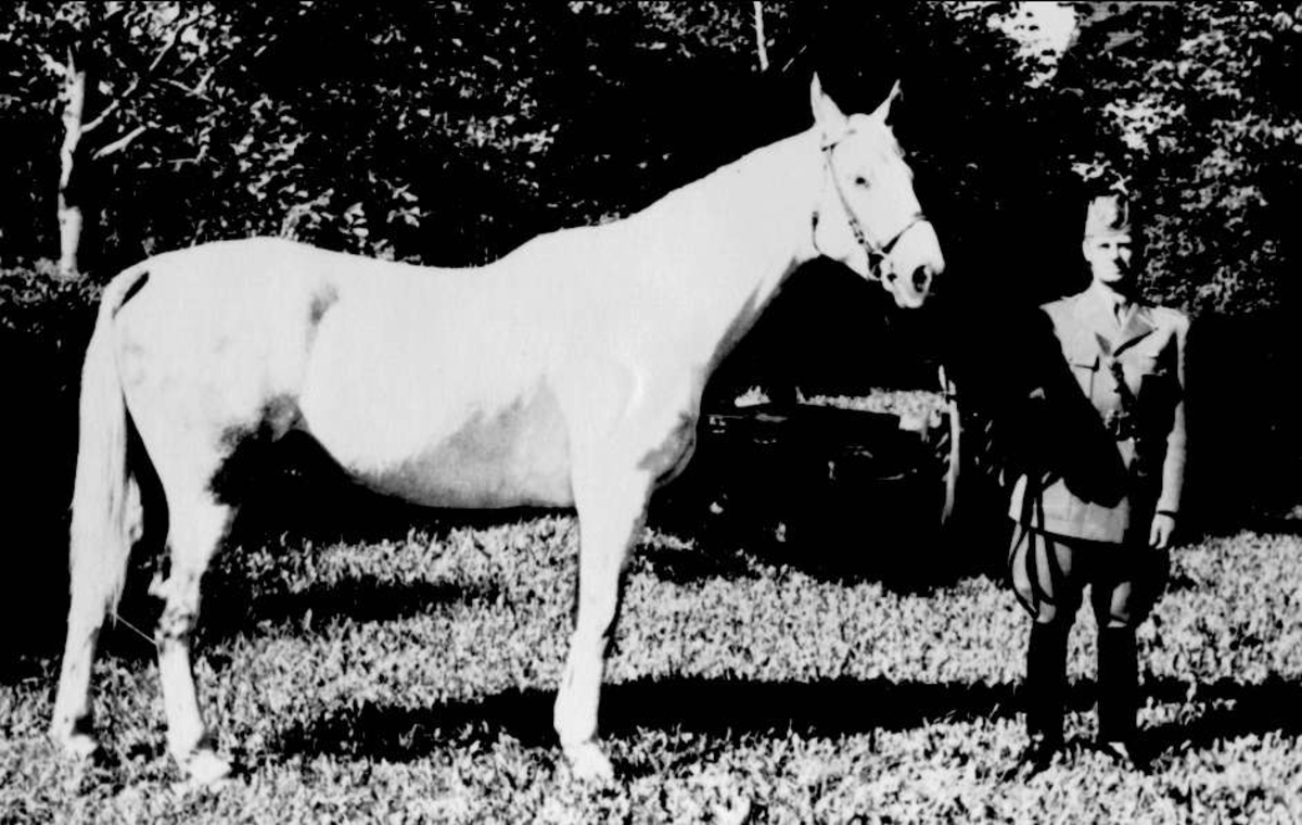Majoren vid K 3, Sven Littorin, med en av sina älskade "vinterhästar" (=vit häst bredvid källan) på Sanna Hed.
