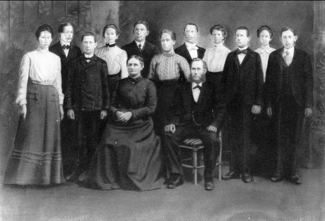 Sadelmakare Lars Gustafsson med hustru Anna Matilda och deras stora barnaskara. En av sönerna emigrerade till Norge, nio till Amerika. Den yngsta dotter Regina stannade kvar i Karlsborg och är mor till Artur Lundgren som fortfarande på 2000-talet bor kvar i familjens hus i Rödesund.