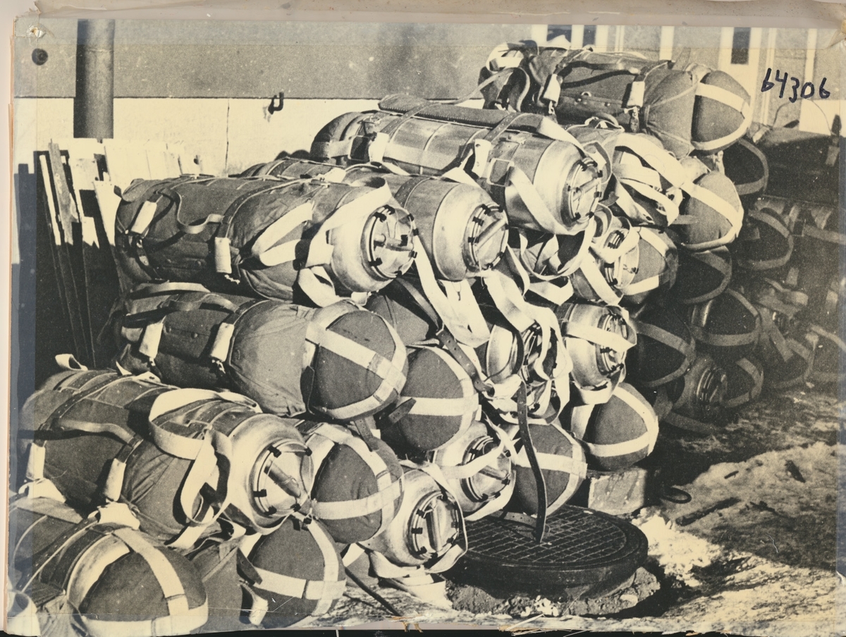 F6 i Karlsborg. Behållare "matbomber" med fallskärm och upphängningsanordningar. Fälldes i mars 1942 av B5:or ur 2. och 3. divisionen för att förse befolkningen inom insnöade områden i landet med proviant.