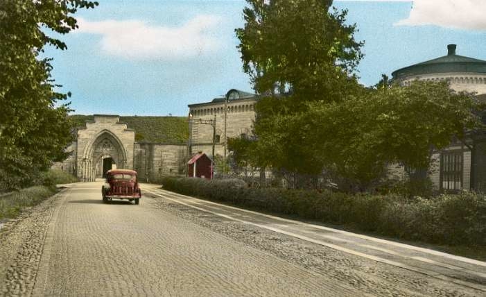 Fästningen, Götiska valvet. Det lilla huset till höger innehöll någon form av transformator. Vykort. Fotot taget omkr 1940. Neg finns. Gåva av Dagmar Karlsson, Mölltorp.