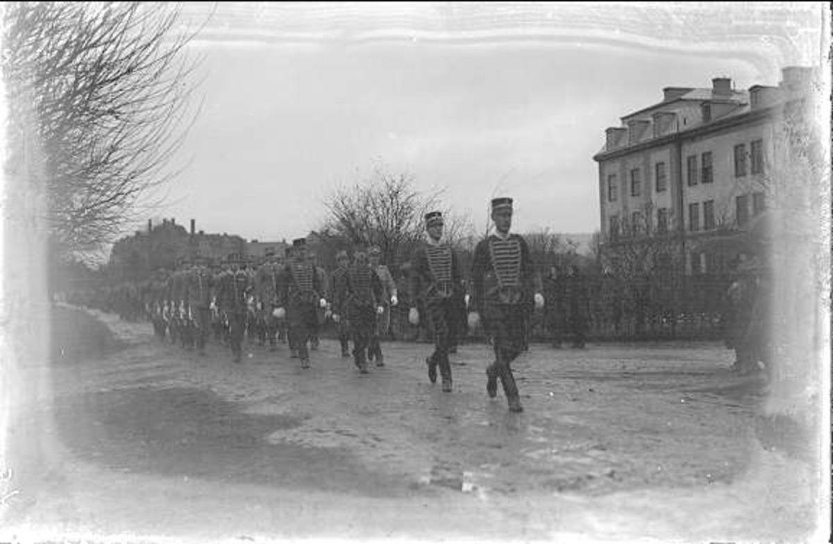 Marsch från soldathemmet tillbaka till kasern. Antagligen efter korum.