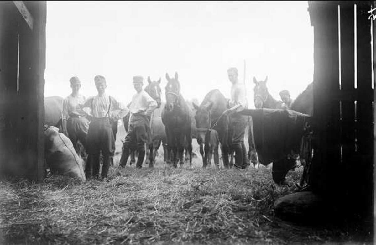 Sommarmarsch fältmässig förläggning. Ladan hos någon välvilligt sinnad lantbrukare får användas som tillfälligt stall.