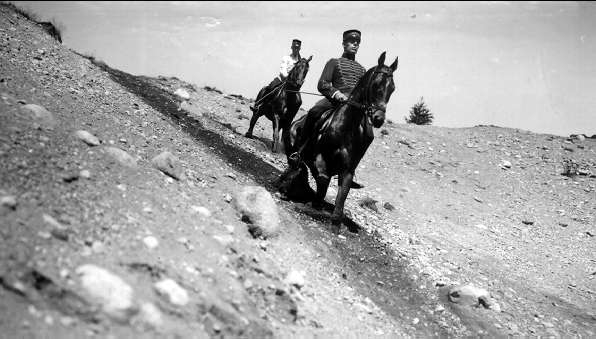 Klättring i grustag ner och upp för att stärka hästens benmuskler. Strömsholm 1910-11.