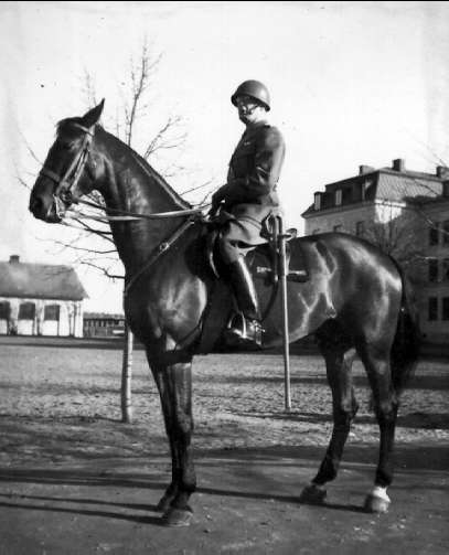 Sekundchef överste Gösta Bergenstråle på sin tjänstehäst på Kaserngården, söder stallarna.