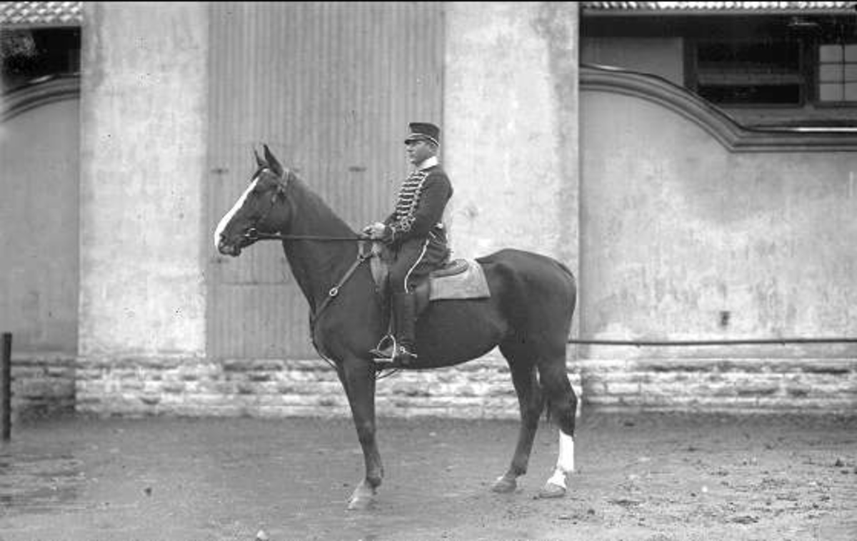 Livhusar på tilldelad stamhäst vid skvadronstallets östra långsida.