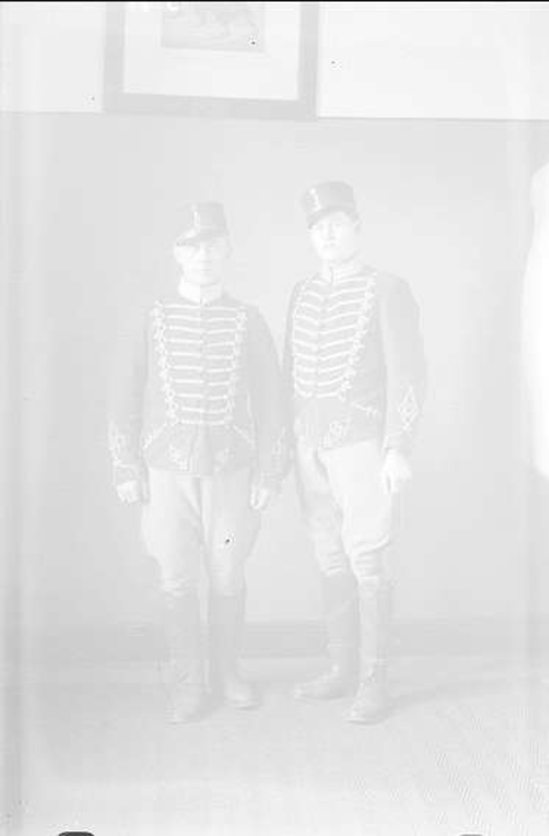 Två livhusarer, klädsel: dolma m/1895, byxor m/10, mössa m/1895, benläder.