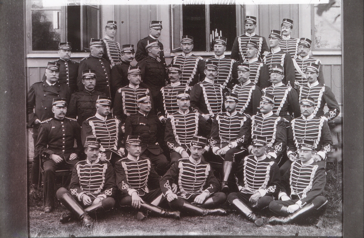 Livregementets husarer. Husarlägret på Sanna hed. Officerskåren 1895. I mitten Överste Wilhelm Leuhusen, tv. om honom: Prins Eugen. Övre raden andra från höger: Greve Claerense von Rosen.