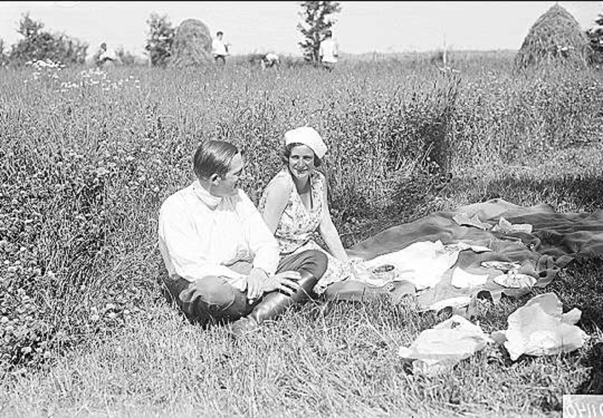 Hans Fock med sin första fru. Han bär byxor till uniform m/23. Vapenrocken har han tagit av i värmen, men till den modellen bars halsbinda och den är kvar. En hästfilt är utbredd på vilken lunchen var serverad. Damen, liksom hans synas trivas ganska väl.
