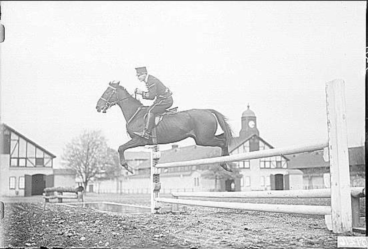 Hästskötare träningshoppar antagligen utan tillåtelse med officers tjänstehäst. Relativt högt koppelräck på kaserngårdens västra halva. Ryttaren stör hästen i språnget.