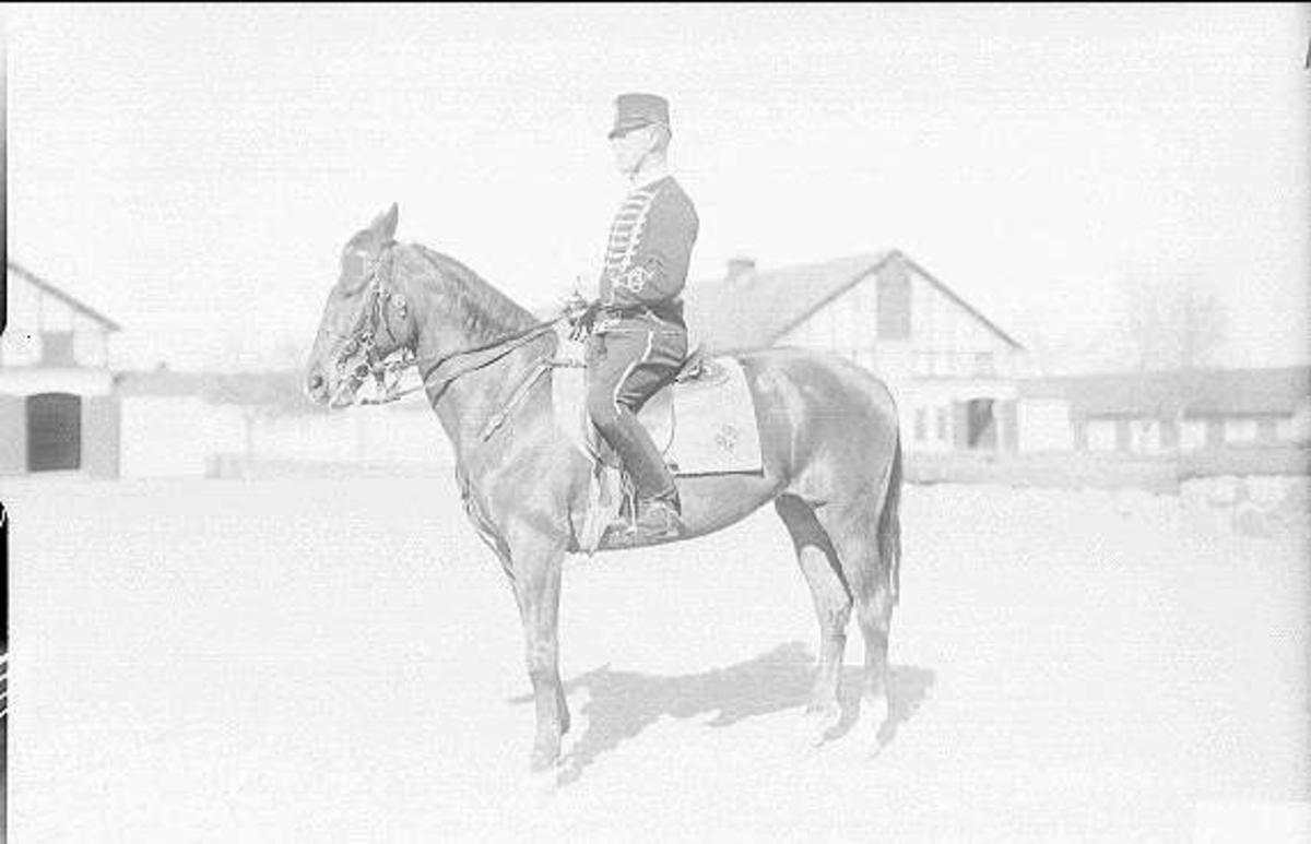 Livhusar i uniform m/ä med tilldelad stamhäst på kaserngården söder om skvadronsstallarna.