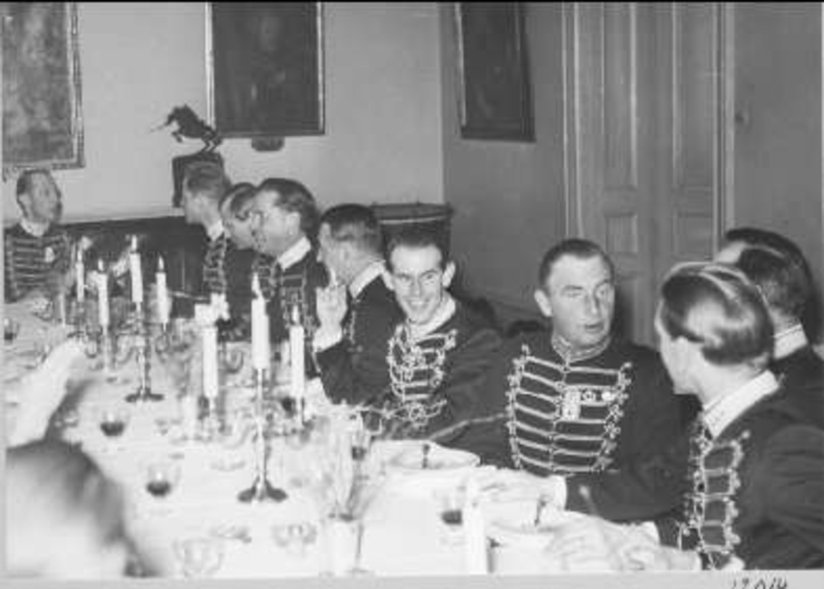 K 3 mässmiddag för Ryttmästare Folke Linton. Vid middagsbordet från höger: Stig Aaby-Ericsson, Torsten Nelson, Gunnar Bergström, Kalle Palmstierna, Gunnar Schildt, Rickard Montgomery-Cederhielm, Gösta Streiffert, Anders Westergren, Stig von Heijne.