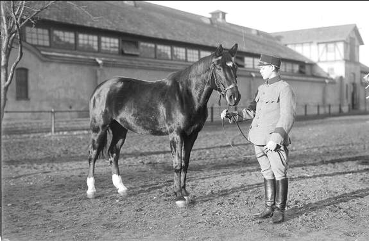 Titel: Livhusar i uniform m/1910 med stamhäst, öster om skvadronstallet