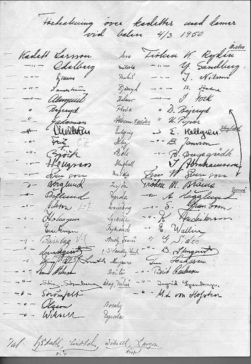 Kadettbal 4 mars 1950 på K3 officersmäss. Befäl med damer i andra raden från vänster: Mats Brunner , Magnus Fornell , Sissi Fornell , Sven Kjellgren , Greta Bergenstråle , Sven Viktorin, Rut Viktorin, Gösta Bergenstråle , Ulla Kjellberg , Hans Rumstedt , Erik Hedenstierna , Karin Hedenstierna , Gösta Steijffert , Sture Ullsten . (signalofficer, stående längst till höger.).