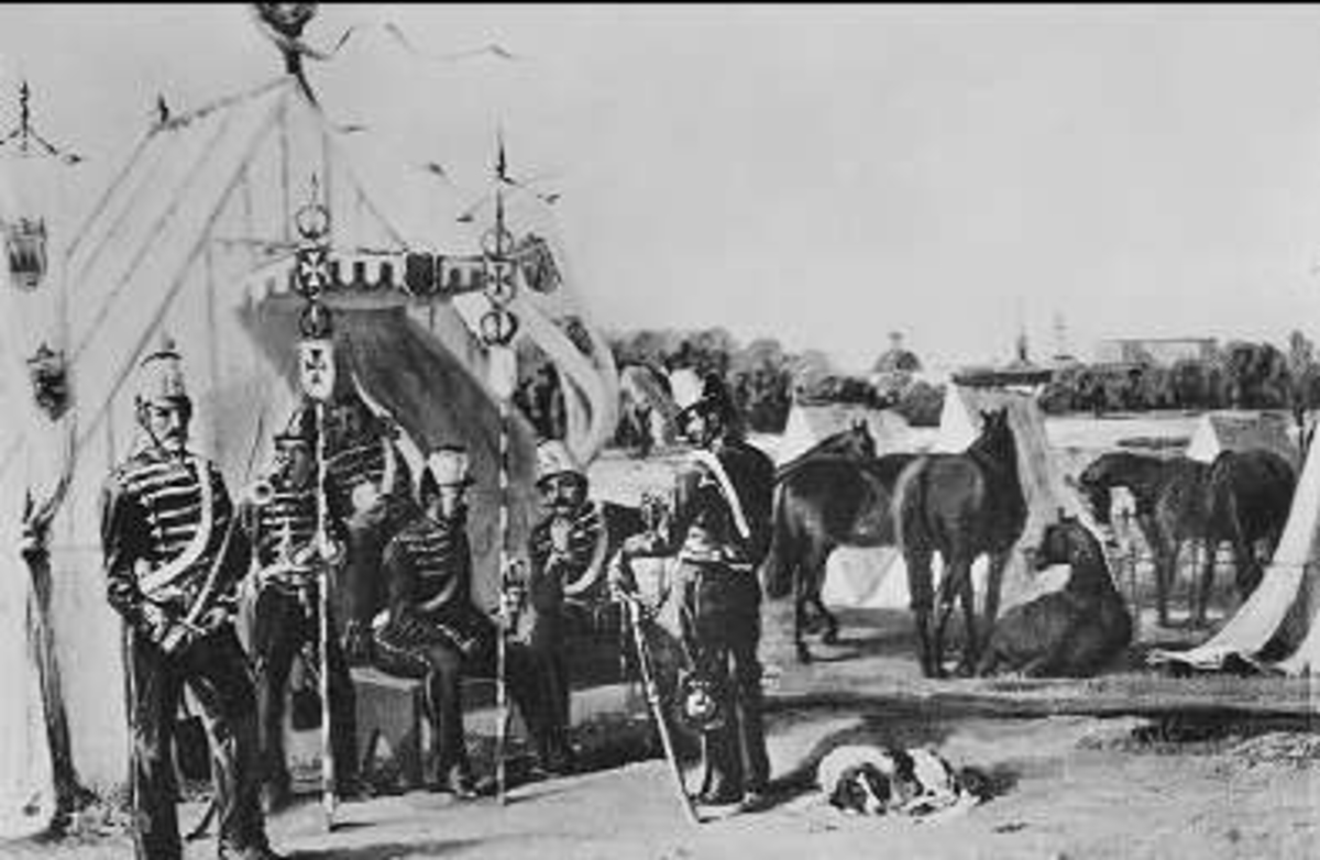 "Husarlägret å Ladugårdsgärde med gamla vakttält". Tavlan målad av J Arsenius. Finns på K 3 mäss.