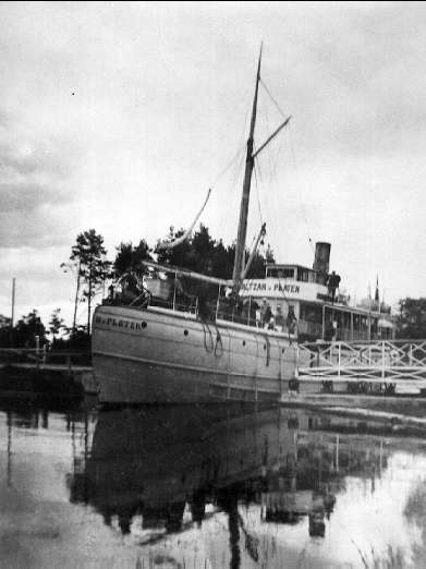 Parti från Göta kanal. Passagerarbåten Baltzar von Platen passerar Rödesundsbron (rullbron). Neg. finns.