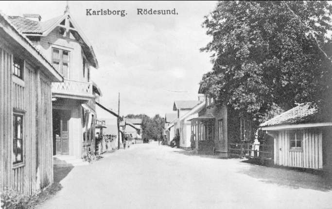 Gatubild från Rödesund, Storgatan med den gamla bebyggelsen. Till höger fattigstugan, till vänster skräddare August Johanssons hus vars verksamhet senare övertogs av sonen Tage Johansson. Kortet är en gåva av Ulla Pettersson. Neg. finns.