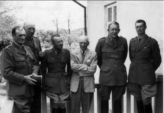 Remonteringsnämndsmöte på Gudhem. Från vänster: ryttm P G Westerström nämndordförande, major Elias Ahlqvist depåchef, okänd, fältveterinär Hellgren, bataljonsveterinär J Munthe, major Sven Littorin.