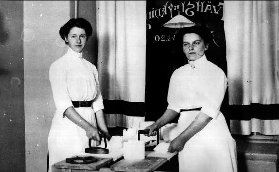 Stockholm år 1913, från vänster forsviksflickan Dagmar Andersson (född 1892). Hon arbetade som strykerska på en tvätt- och strykinrättning i Stockholm. Flickan till höger okänd.