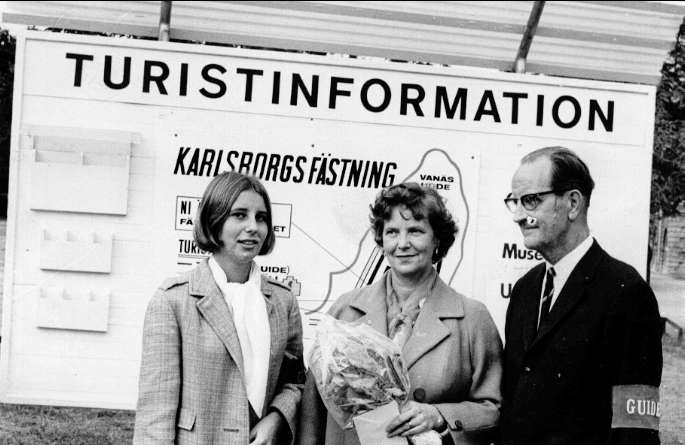 Karlsborgs fästning. POS Borg (guide) med två besökande damer.