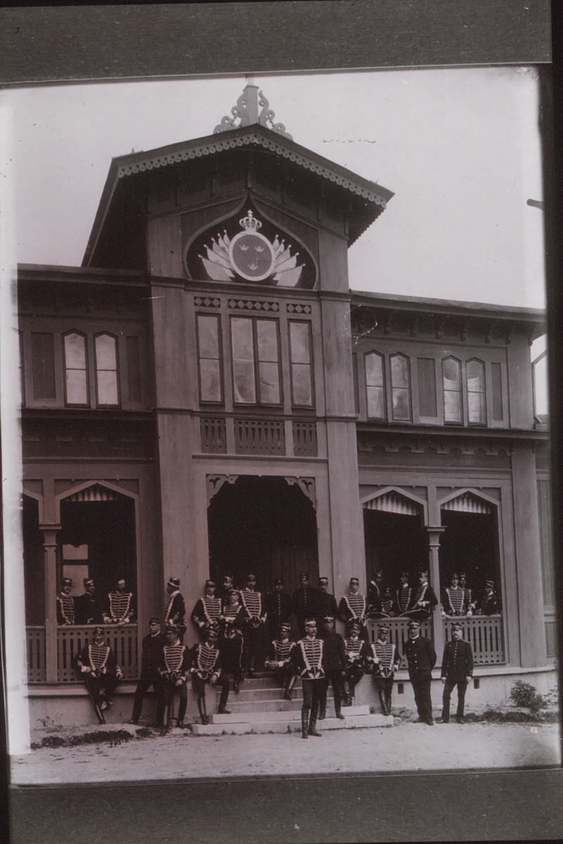 Livregementets husarer. Husarlägret på Sanna hed omkring 1900. Officersmässens entrè.Längst fram översten och sek.chefen friherre Wilhelm Leuhusen. Till höger om högra pilastern H.K.H Prins Eugen som ryttmästare. Till vänster om pilastern, den vänstra av officerarna greve Clarence von Rosen.