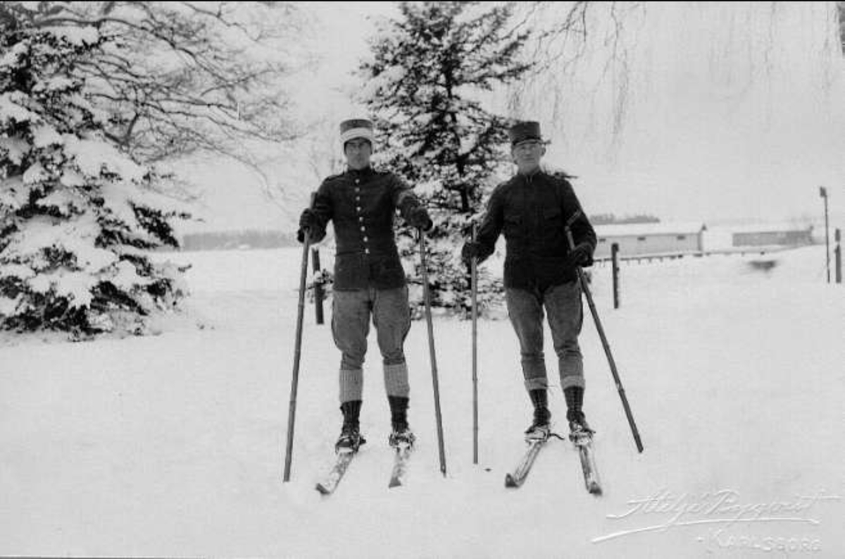 Två skidande militärer, fotot är taget från Kärleksstigen med Vättern i bakgrunden. Vykort.