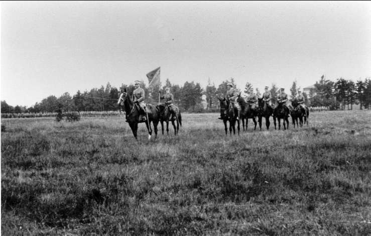 Karlsborg. Uppställning med ryttare och fana på heden.