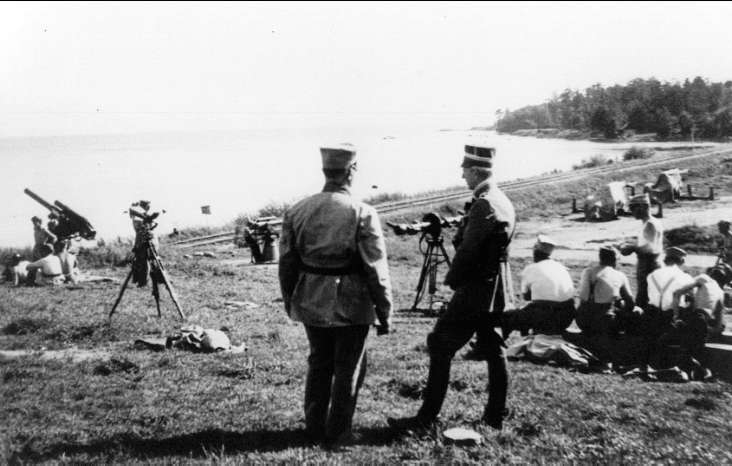 Artilleriet, skjutning från skjutplatsen vid Vätterstranden. Järnvägsspår syns vid sjökanten.