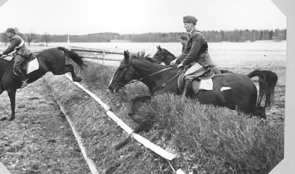 Ridkurs 12/10 1954-13/5 1955 Strömsholm.Från tävlingar maj 1955.Deltagare från Livregementets husarer, K3:Fänrik Westergren, överfurir Fridolfsson och sergeant Ewert Olausson.Förteckning över övriga deltagare finns i albumet.Chef för ridskolan:Överstelöjtnant Gustav Nyblaeus.Förteckning över övriga lärare finns i albumet.Albumet är en donation från Ewert Olausson.