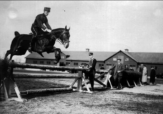 Träningshoppning på stallplan framför officersstallet. Strömsholm 1910-11.