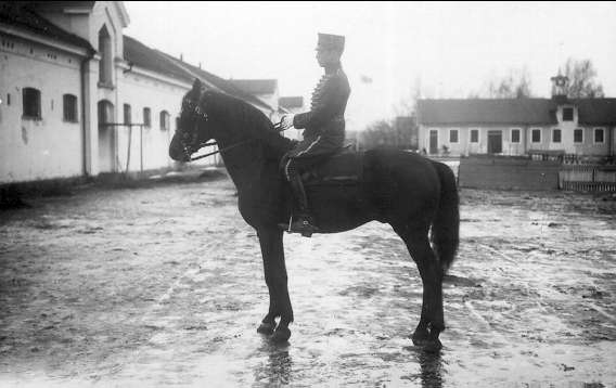 Strömsholmskursen 1916. Ridning på Strömsholm på Stallplan mellan lilla ridhuset (till vänster), officersstallet (till höger), hingstridhuset och hingststallet.