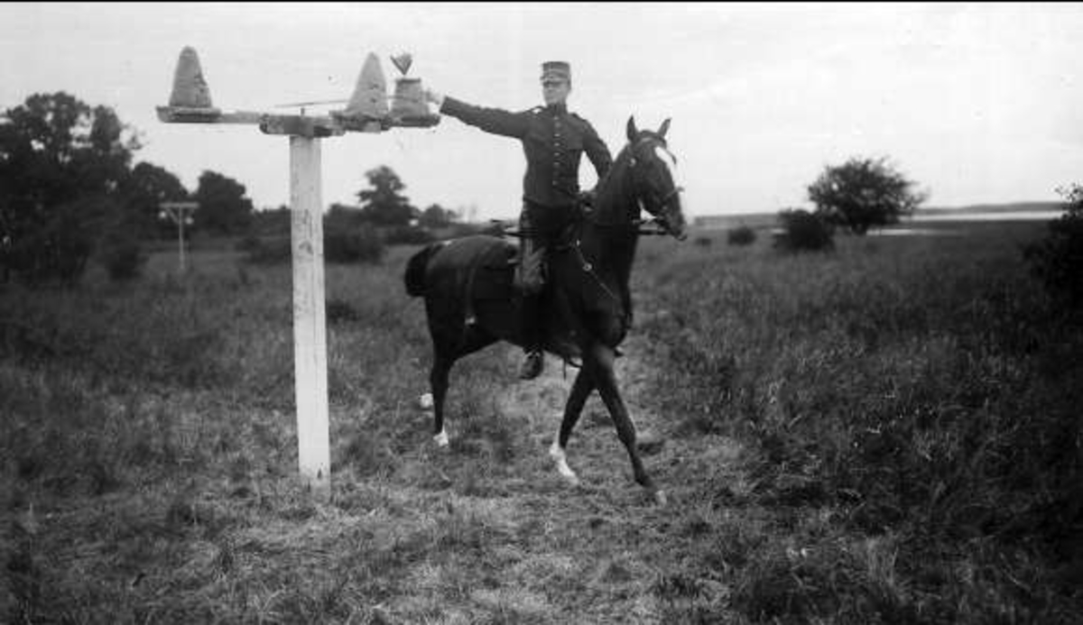 Sabelfäktning till häst på Österängen, Strömsholm 1910-11. Sjön Freden i bakgrunden.