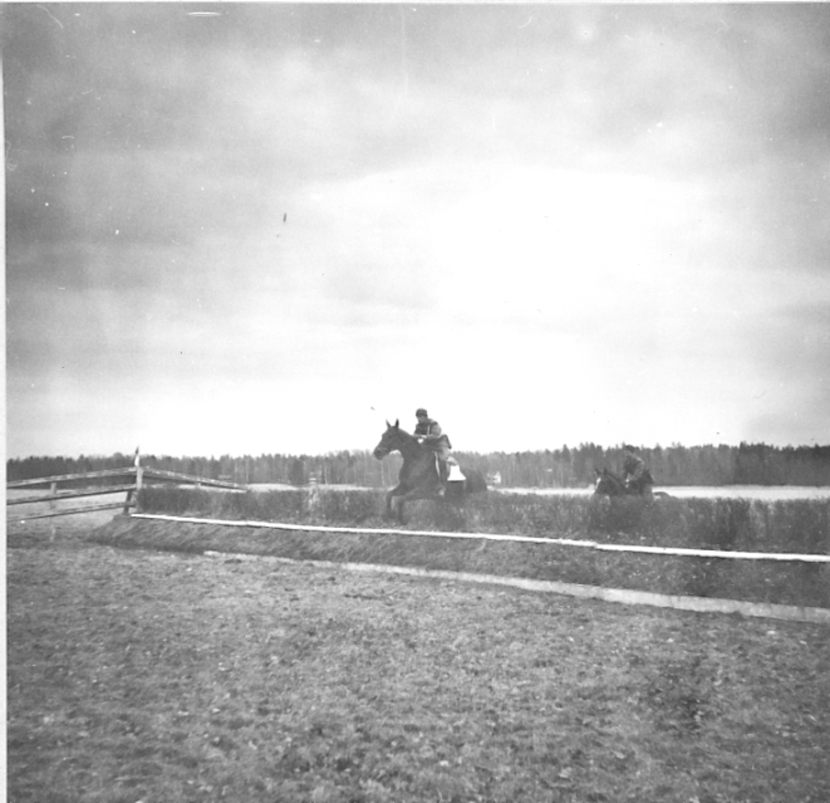 Ridkurs 12/10 1954-13/5 1955 Strömsholm.Från tävlingar maj 1955.Upploppshäcken.Deltagare från Livregementets husarer, K3:Fänrik Westergren, överfurir Fridolfsson och sergeant Ewert Olausson.Förteckning över övriga deltagare finns i albumet.Chef för ridskolan:Överstelöjtnant Gustav Nyblaeus.Förteckning över övriga lärare finns i albumet.Albumet är en donation från Ewert Olausson.