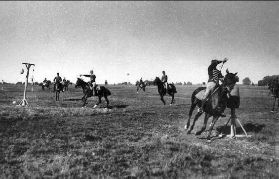 Sabelexercis på Sannahed. Här övar husarerna sabelattack. Målen för attackerna är bland annat uppstoppade halmfigurer och andra hängande föremål.