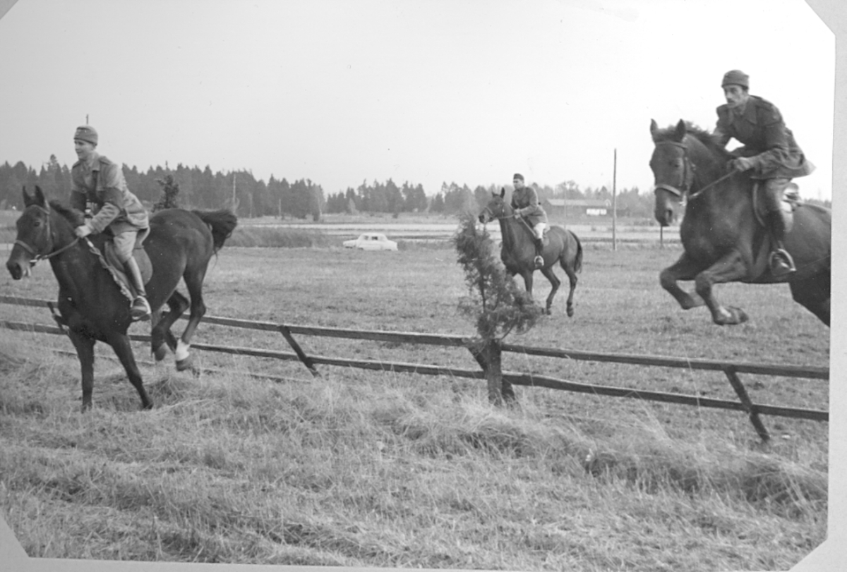 Ridkurs 12/10 1954-13/5 1955 Strömsholm.Som vänster pikör:Ewert Olausson.Deltagare från Livregementets husarer, K3:Fänrik Westergren, överfurir Fridolfsson och sergeant Ewert Olausson.Förteckning över övriga deltagare finns i albumet.Chef för ridskolan:Överstelöjtnant Gustav Nyblaeus.Förteckning över övriga lärare finns i albumet.