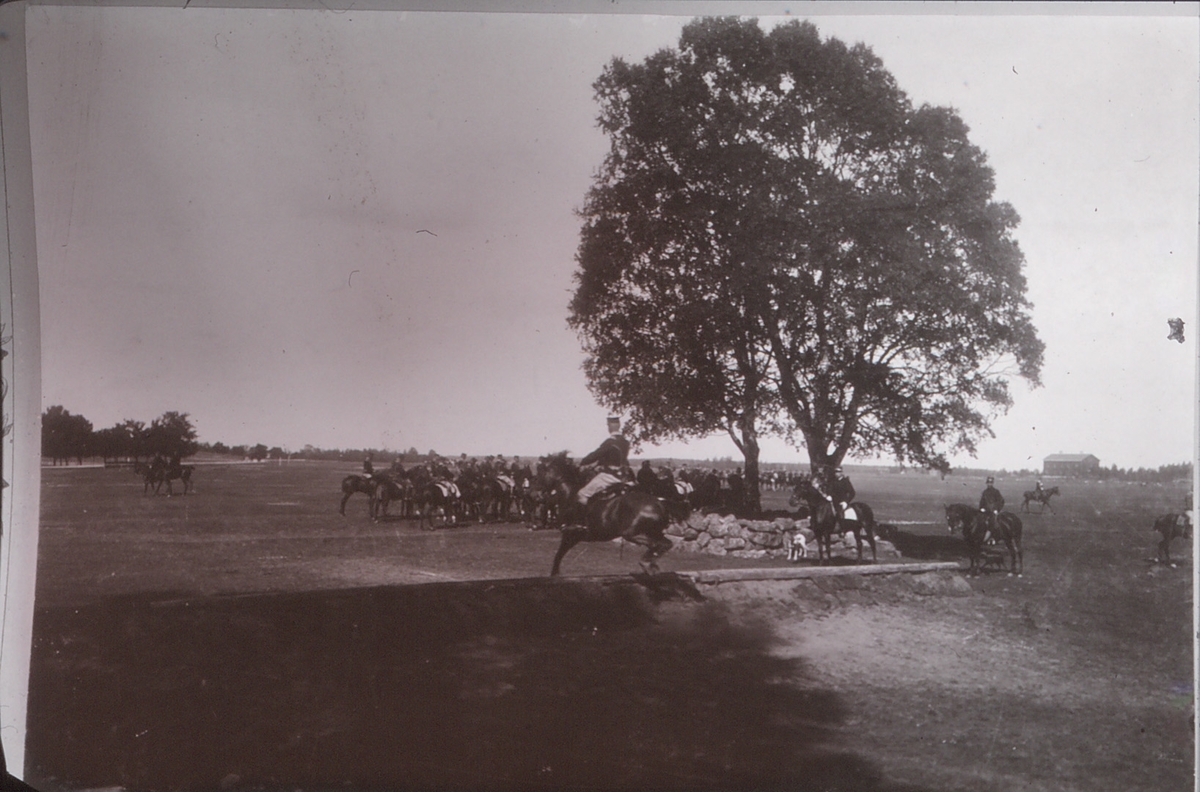 Livregementets husarer. Husarlägret på Sanna hed. Korpral Bogenheim hoppar ett hinder vid källan där nu en minnessten är rest. En skvadron rastar i bakgrunden.