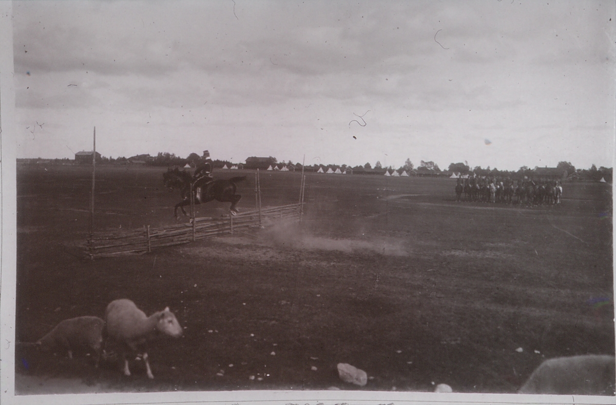 Livregementets husarer. Husarlägret på Sanna hed. Underofficer visar hopp över koppelräck. Början 1900-tal.