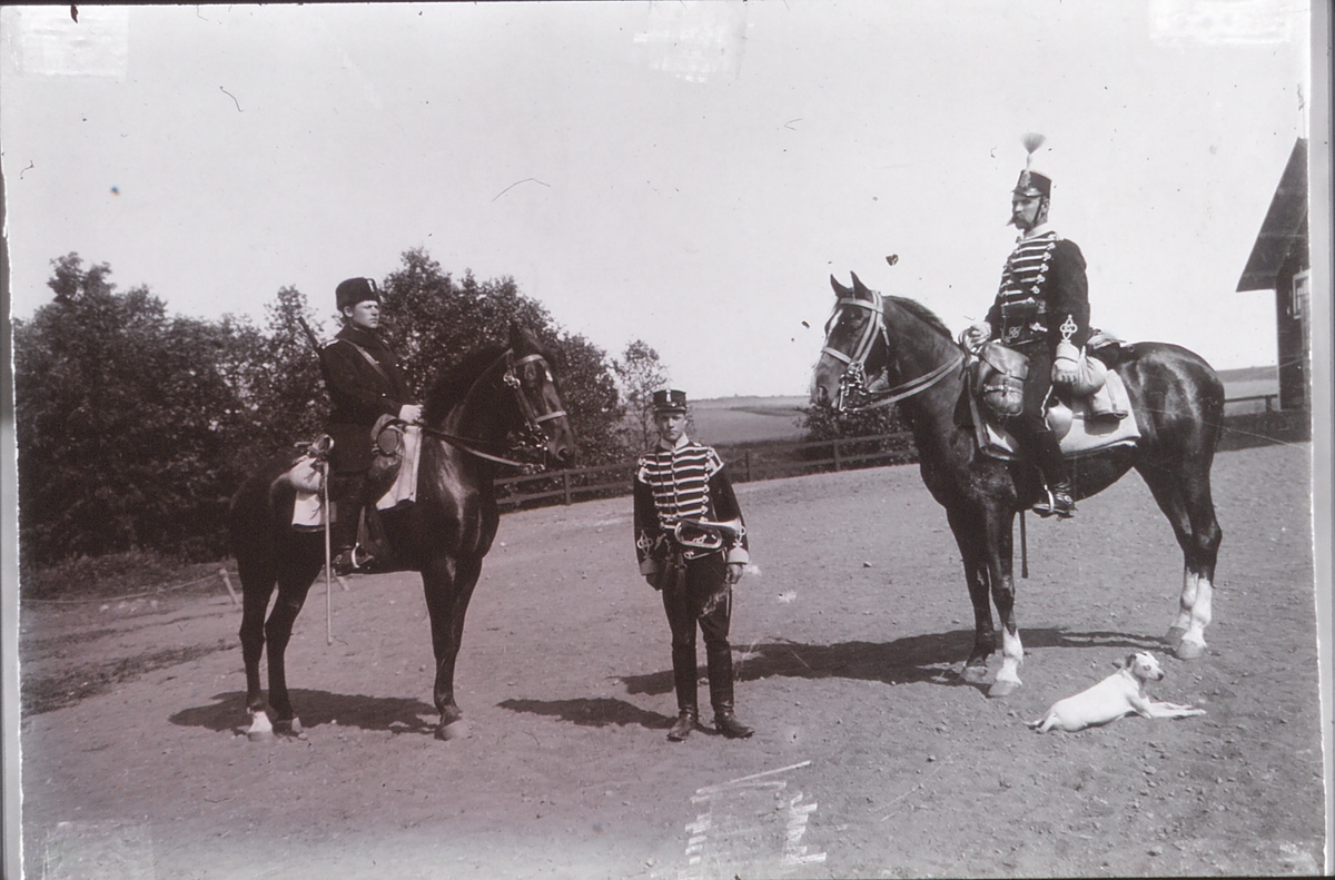 Livregementets husarer. Husarlägret på Sanna hed slutet 1800-tal. Husar i paraduniform med vit plym i högmössan. Skvadronstrumpetare, ryttare av okänt ursprung.