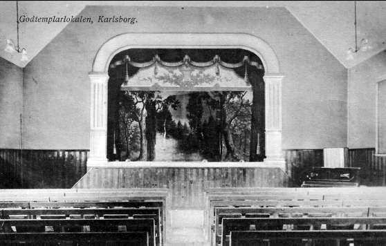 Karlsborg. Interiör godtemlargården (teaterbio) byggår och invigning år 1914. Vykort. Byggnaden revs sommaren 1998.