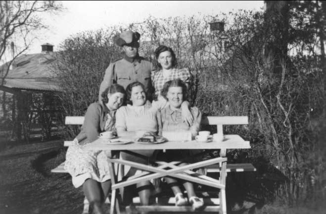 Karlsborg, kafferast på ammunitionsfabriken 1940-tal. Stående till höger Greta Andersson, sittande till vänster "Anna på kullen" född på Vaberget. Vakten iklädd m/10. Förstoring 30 x 40 cm. Neg finns.