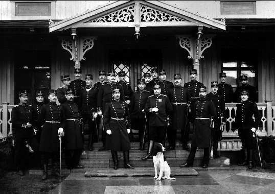 Infanterivolontärskolan Karlsborg, senare rekrytskolan för infanteriets off- och res. off. Aspiranter 1878 - 1927. 1902, befälsbyggnadens huvudingång vid infanteriets volontär- och senare officersaspirantskola på Karlsborg.