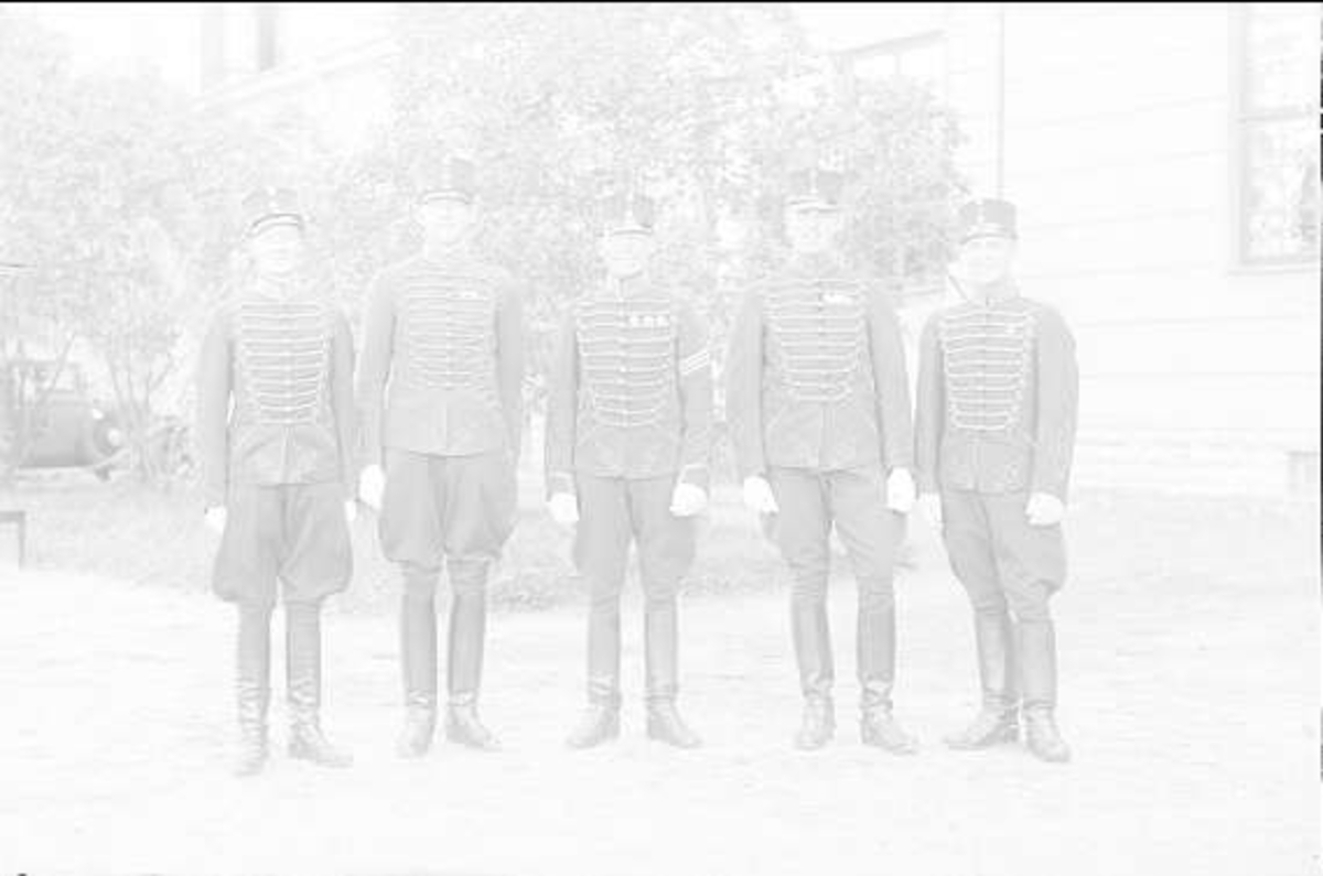 Underbefäl ur K 2 som genomgått armens underofficersskola, (tresterckad furir) tjänstgörande vid aspirantskolan tillsammans med fyra elever från K 2 Häsingborg i uniform m/1895 (m/ä). Till vänster i bild aspirant Ask. Gruppbild.