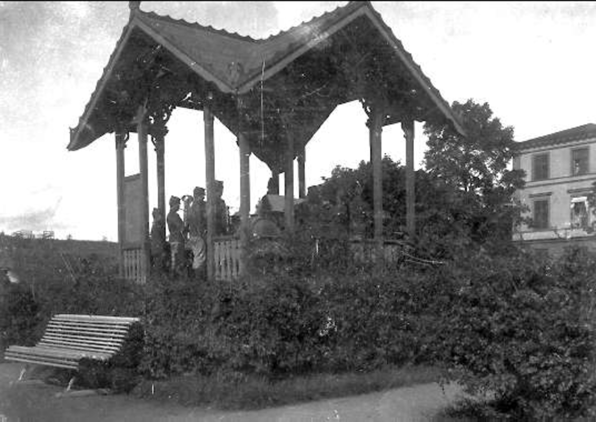 Karlsborgs fästning, musikpaviljong framför slutvärnet omkring år 1902. Middagskonsert av Göta ingenjörkårs musikkår.