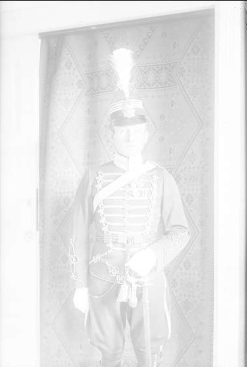 Livhusarofficer i uniform m/ä, stor paradmössa m/1853 med plym, knutskärp m/1778, kartuschrem och kartuschlåda på ryggen, officerssabel m/1893