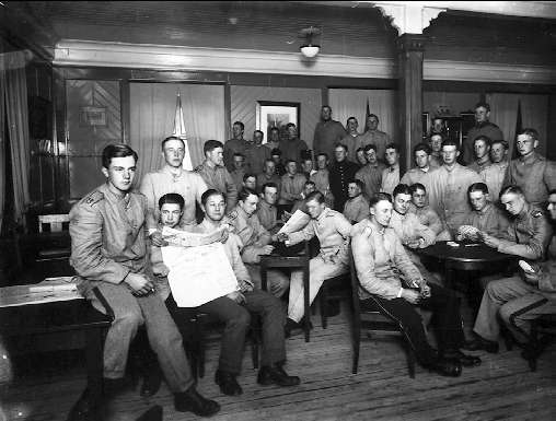 Infanterivolontärskolan Karlsborg, senare rekrytskolan för infanteriets off- och res. off. Aspiranter 1878 - 1927. Interiörbild, volontärer på marketenteriet (mässen).