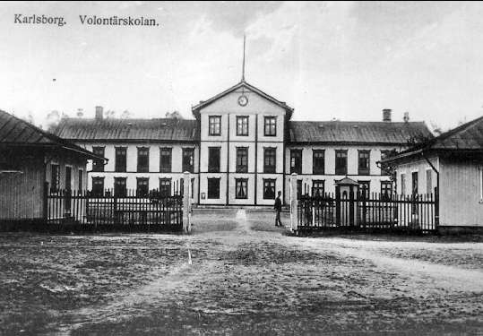 Infanterivolontärskolan Karlsborg, senare rekrytskolan för infanteriets off- och res. off. Aspiranter 1878 - 1927. Mittenkasernen, framför denna två mindre byggnader varav den till vänster var en arrestlokal och den andra vaktlokal (1903).