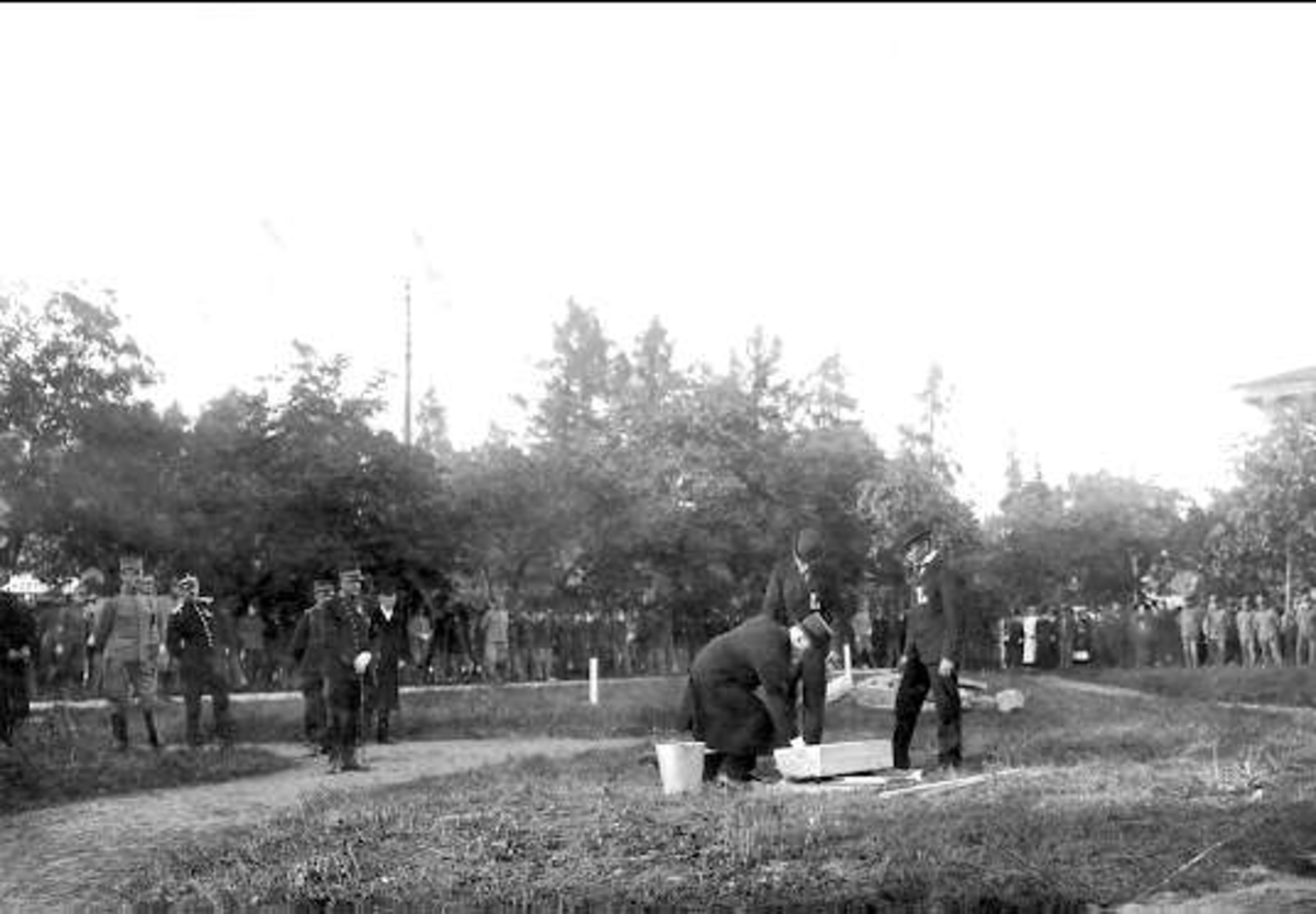 Fästningen. Biskop Danell murar grundstenen till soldathemmet, sept 1917.