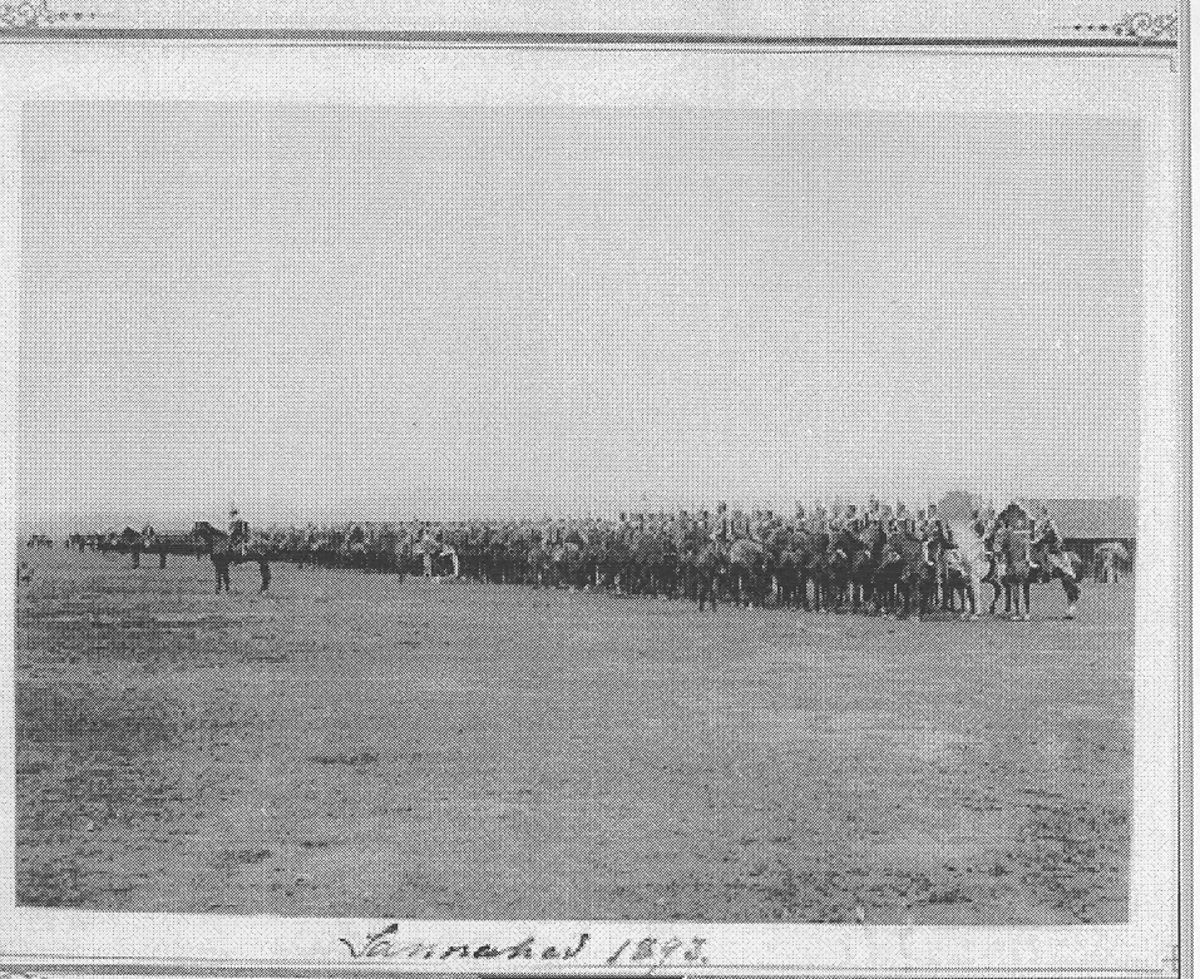 K3. Livhusarer till häst uppställda på linje Sannahed 1893. C V Närke skv. F G Cassel, C Vadsbo skv. A O E Hedenstierna, sekch W Leuhusen, reg KV W von Essen, C livskv A Stedt, C Örebro skv R M Swartling, C Ö Närke skv C F C Reuterswärd.