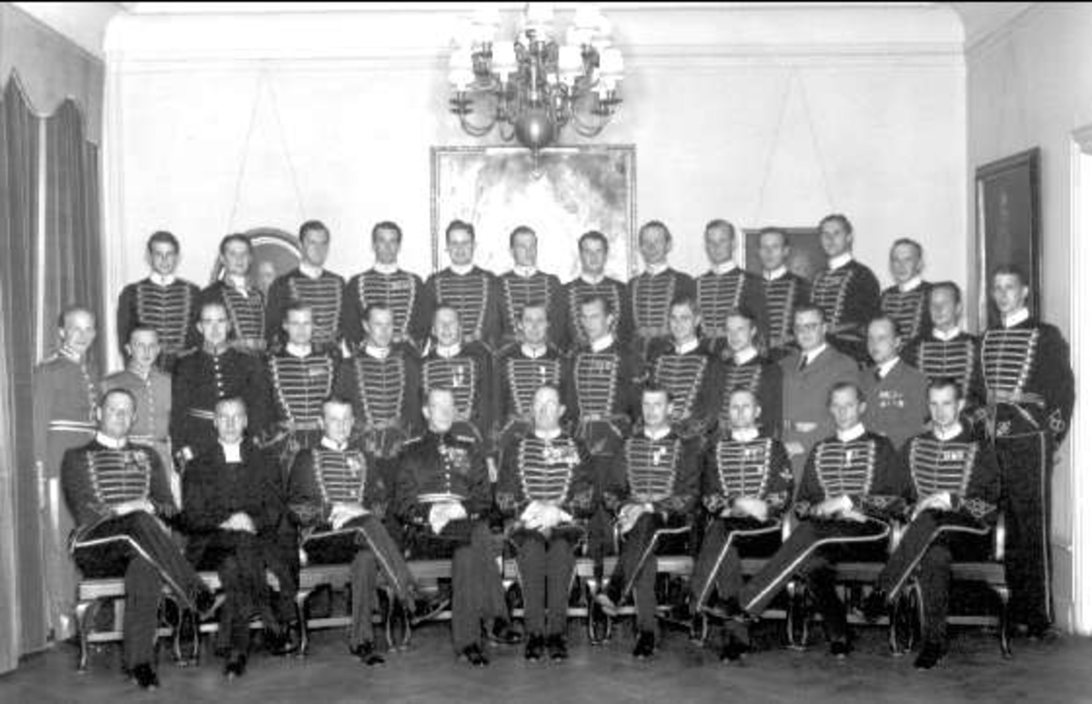 Troligen officerskårens avskedsmiddag för avgående sekundchefen Gösta Bergenstråle. Namn på alla deltagare finns vid fotot.