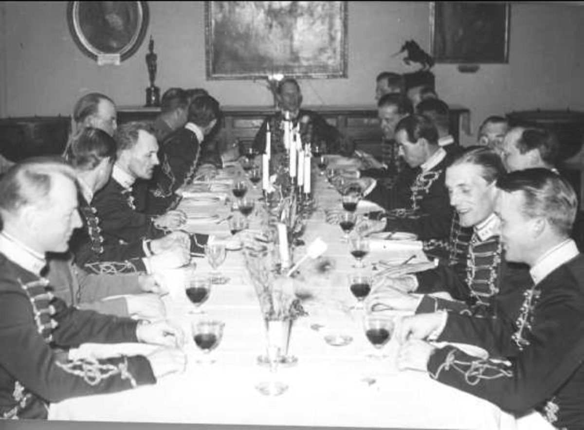 K 3 mässmiddag för Ryttmästare Folke Linton. "Dolmamiddag". Vänstra raden: Sven Hugo Rizell, Regemtsintendenten (skymd) Sven Kjellberg, Folke Linton, Magnus Bruzelius, Eric Sörensen, Högre raden; (närmast bordet), Per Blomkvist, Stig Aaby-Ericsson, Kule Palmstierna, Richard Montgomery-Cederhielm, Stig von Heijne (mässofficer).